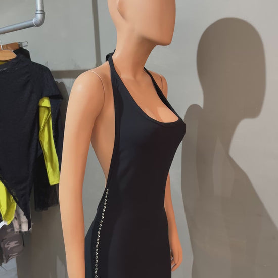 Vestido elaborado en burda, decorado con taches en acero inoxidable, cuello ajustable y con buena elasticidad